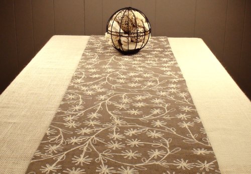 This is beautiful 14" wide table runner in light brown/tan color embroidered with white floral pattern. The feel of this fabric is on rougher side - it feels almost like a burlap. This table runner is underlined with solid linen. This listing is for 14" wide and 60" long table runner but other sizes are also available. To preserve the shape and longevity of this table runner, dry clean is recommended.Please, allow 3 business days to ship. [else][endif] [if
